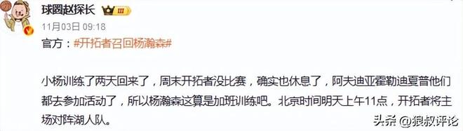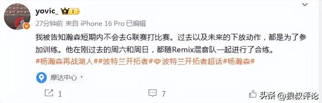 北京時(shí)間11月4日,根據(jù)開(kāi)拓者中文記者“yovic”的報(bào)道,我被告知楊瀚森短期內(nèi)不會(huì)去發(fā)展聯(lián)盟聯(lián)賽打比賽。過(guò)去以及以后的下放動(dòng)作,都是為了參加訓(xùn)練。