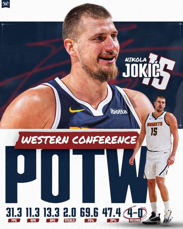 過去這一周,30歲的約基奇場均貢獻(xiàn)31.3分、11.3個籃板、13.3次助攻和2.0次搶斷,投籃命中率達(dá)69.6%,三分命中率為47.4%,帶領(lǐng)掘金隊取得了4勝0負(fù)的不敗戰(zhàn)績。