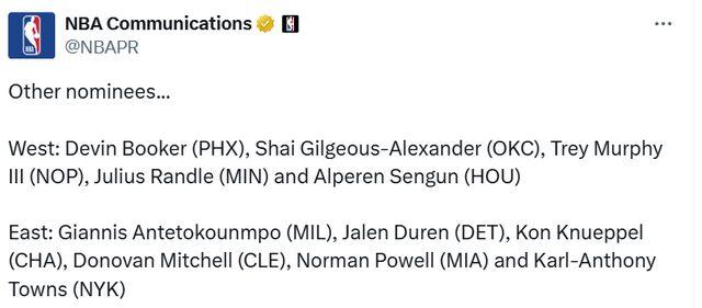 西部:布克(太陽)、亞歷山大(雷霆)、墨菲(鵜鶘)、蘭德爾(森林狼)、申京(火箭)